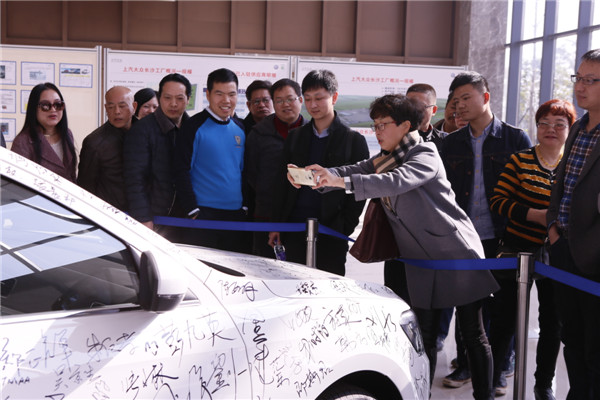 最值得大家注意的,就是这台摆在展厅最中间,车身上面都是签名的朗逸。这是上汽大众下线的第一台朗逸,汽车前盖上还有时任省委书记徐守盛,时任省委副书记、省长杜家毫的签名。