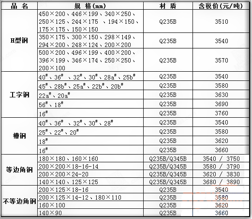1、以Q235B材质价格为基础,Q345B材质的等边角钢价格加价210元/吨,其余品种钢材加价230元/吨;