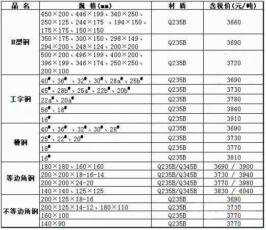 1、以Q235B材质价格为基础,Q345B材质的等边角钢价格加价210元/吨,其余品种钢材加价230元/吨;