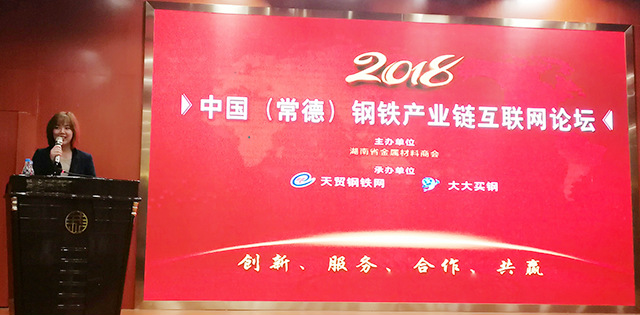 湖南省金属材料商会秘书长、天贸钢铁网董事长、互联网信息服务专家高道花女士从经济形势,电商云平台趋势,天贸产品介绍以及未来钢铁行的畅想四个方面,做了题为“电商云平台趋势与服务”的演讲。