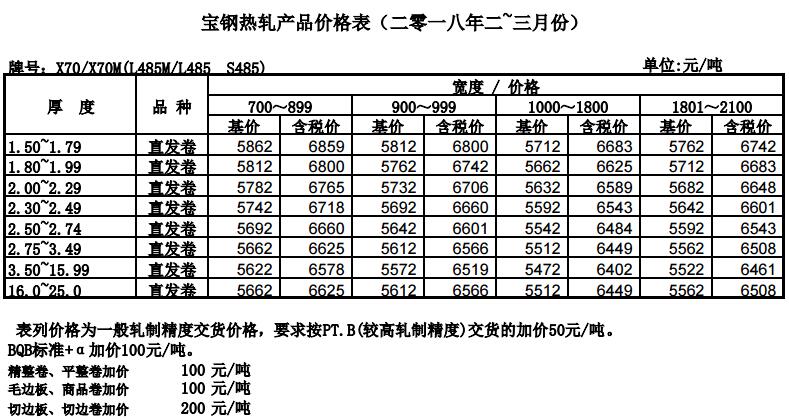2018年2月宝钢热轧产品价格表-X70