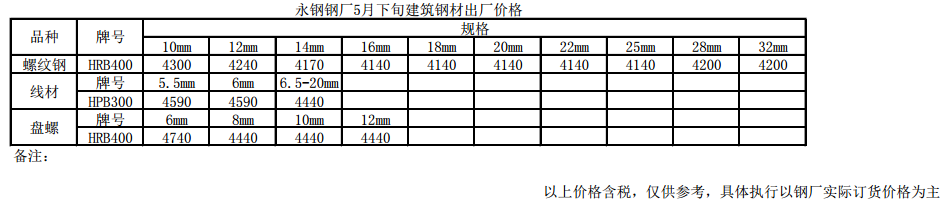 2018年5月21日永钢钢厂建筑钢材5月下旬出厂价格表