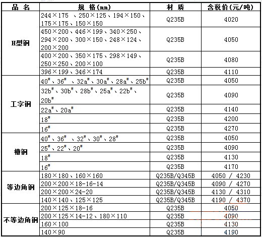 1、以Q235B材质价格为基础,Q345B材质的型钢加价180元/吨;