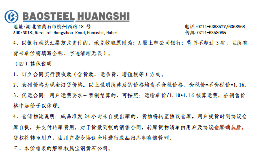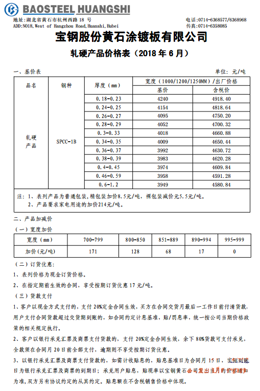 2018年6月份宝钢股份黄石涂镀板有限公司轧硬产品价格表