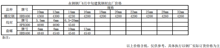 2018年6月11日永钢钢厂建筑钢材6月中旬出厂价格
