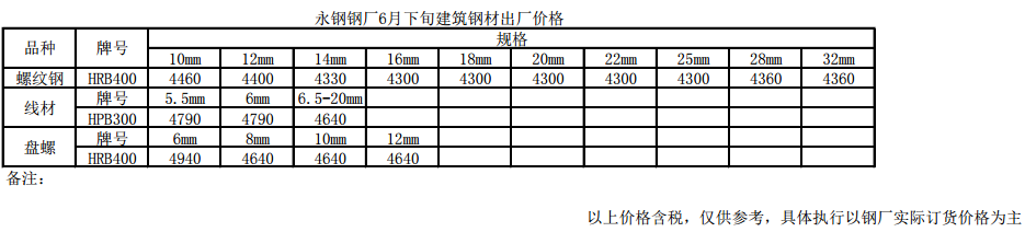 2018年6月21日永钢钢厂建筑钢材6月下旬出厂价格表