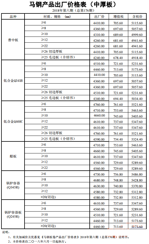 马钢2018年第六期出厂价格表(中厚板)
