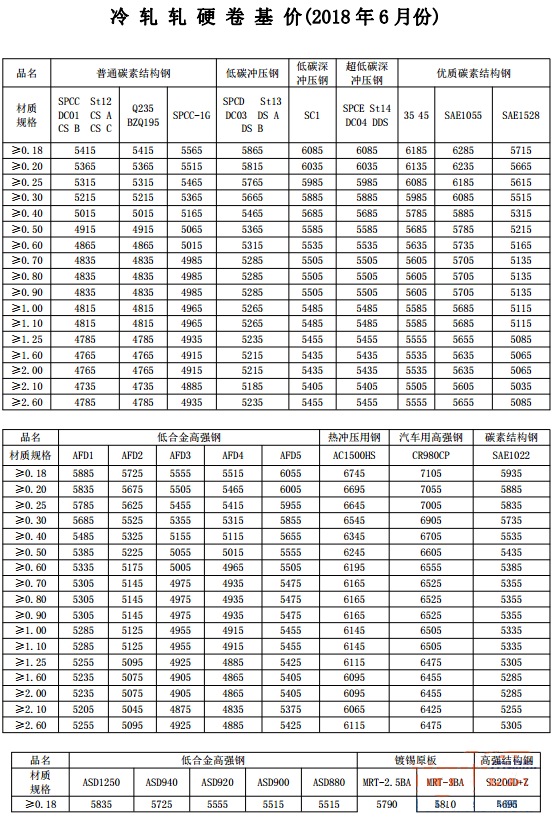 鞍钢2018年6月份冷轧轧硬价格表及政策