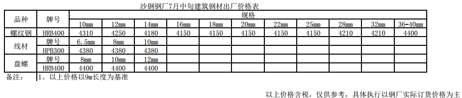 2018年7月11日沙钢钢厂建筑钢材出厂价格表