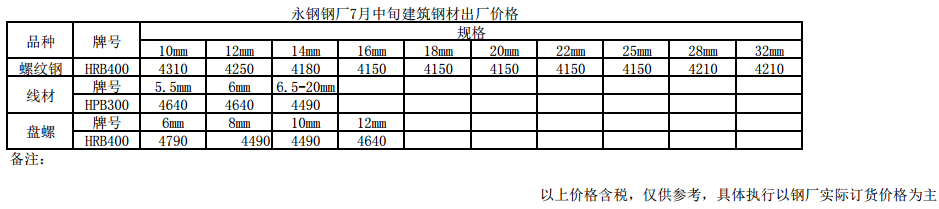 2018年7月11日永钢钢厂建筑钢材7月中旬出厂价格表