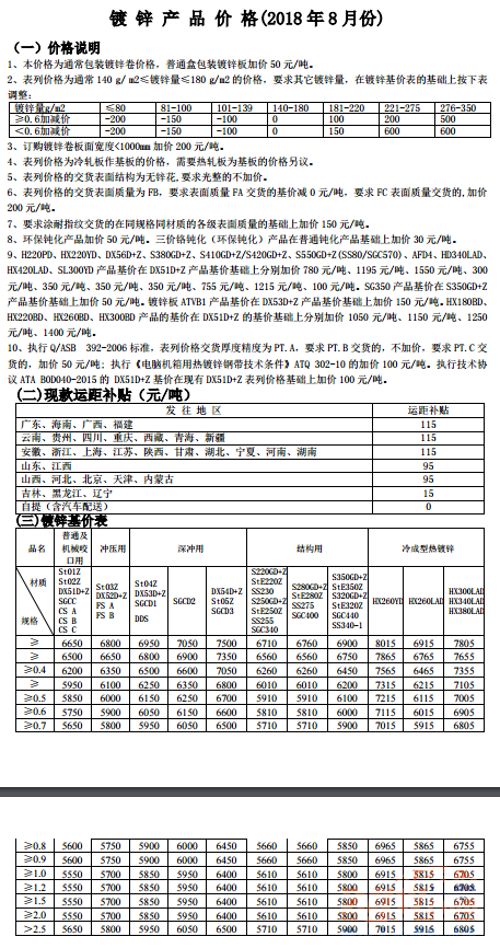鞍钢2018年8月份镀锌价格表及政策