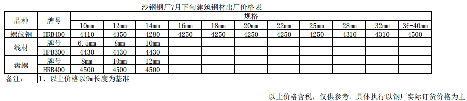 2018年7月21日沙钢钢厂建筑钢材出厂价格表