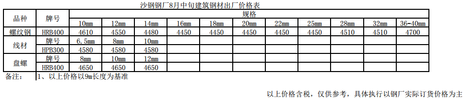 2018年8月11日沙钢钢厂建筑钢材出厂价格表