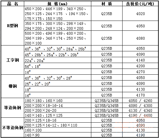 1、以Q235B材质价格为基础,Q345B材质的等边角钢价格加价210元/吨,其余品种钢材加价230元/吨;