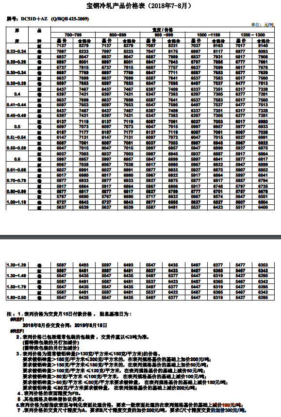 2018年7-8月宝钢镀铝锌产品价格表