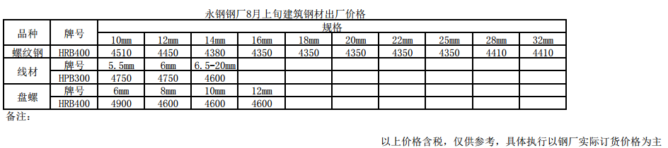 2018年8月1日永钢钢厂建筑钢材8月上旬出厂价格表