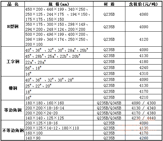 1、以Q235B材质价格为基础,Q345B材质的等边角钢价格加价210元/吨,其余品种钢材加价230元/吨;