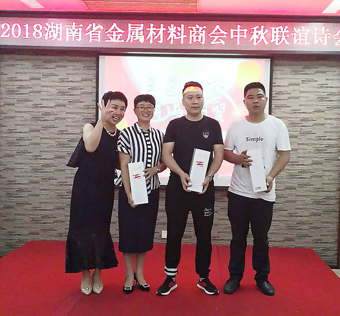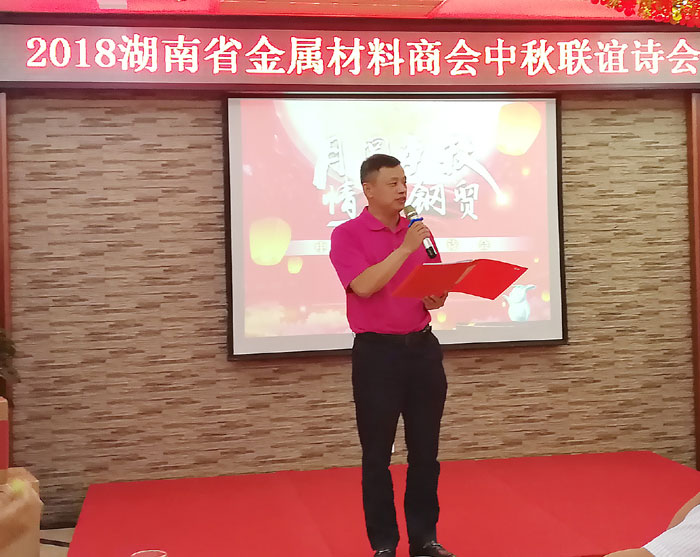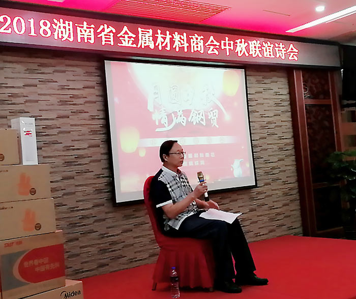 诗会前,罗劲军会长对商会今年已经开展的工作与活动进行了总结汇报。今年,钢贸企业经营基本平稳,1-9月,湖南省金属材料商会不断创新服务模式,以行业和企业的需求,作为商会工作的出发点,为会员企业做了许多的工作。“2018年湖南钢铁流通产业发展论坛暨湖南省金属材料商会年会”、“商会名媛会姐妹鹅洲岛赏花春游活动”、“商会领导健康体检活动”、“2018夏季高端交流会”、“迎七一瞻仰伟人故里韶山活动”、“湖南钢贸企业赴华菱湘钢参观交流活动”、“2018年中国(株洲)钢铁物流互联网论坛”,这一系列活动使会员企业更好的把握机遇,相互交流学习,共同进步。