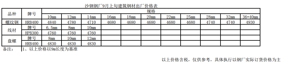 2018年9月1日沙钢钢厂建筑钢材出厂价格表