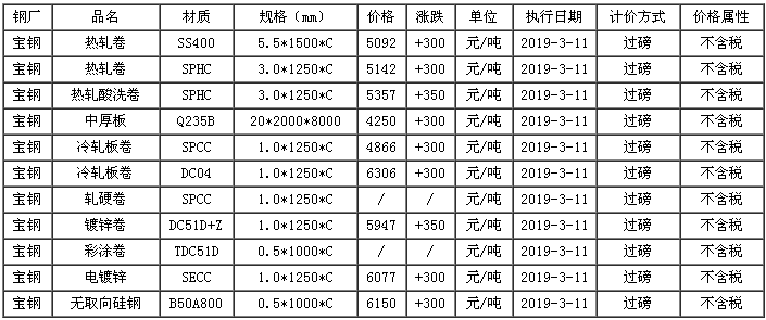 宝钢2019年4月份产品价格汇总表