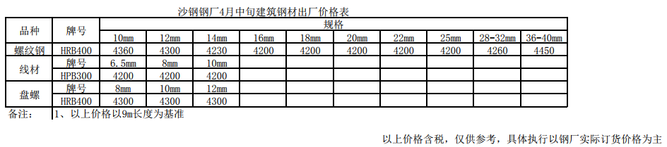 2019年4月11日沙钢钢厂建筑钢材4月中旬出厂价格