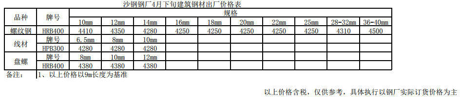 2019年4月21日沙钢钢厂建筑钢材4月下旬出厂价格表
