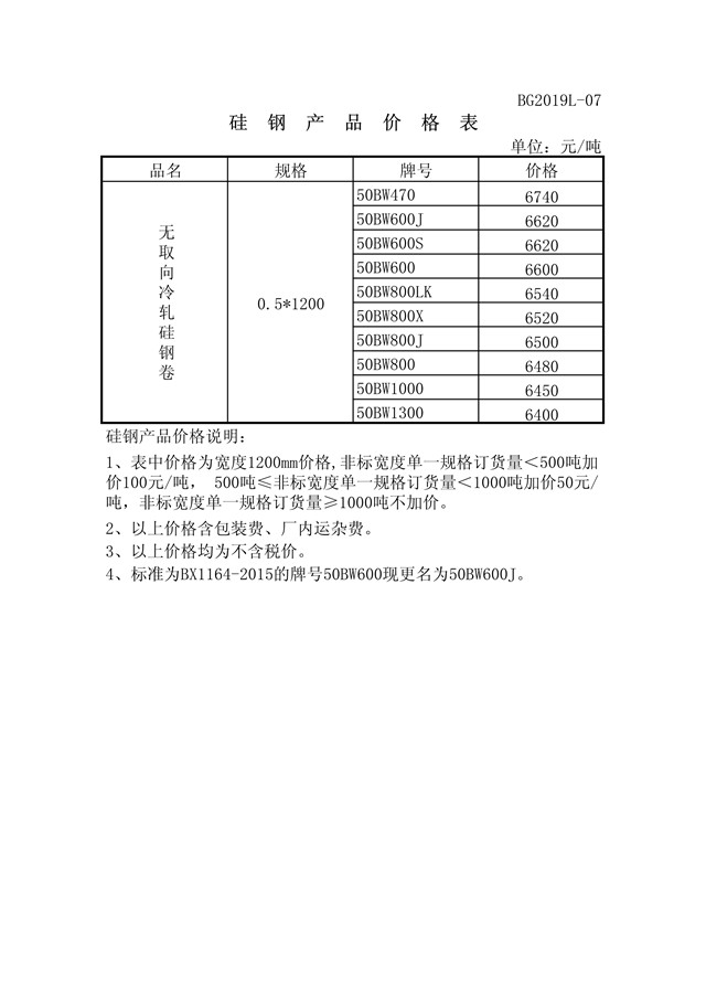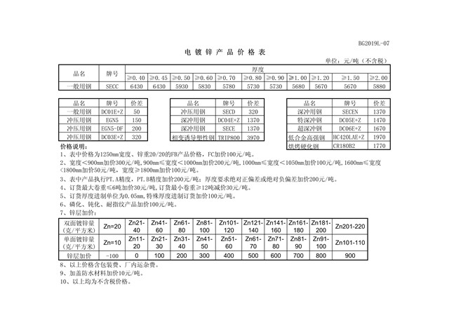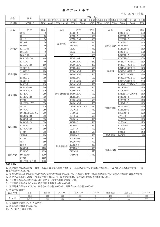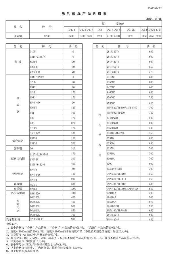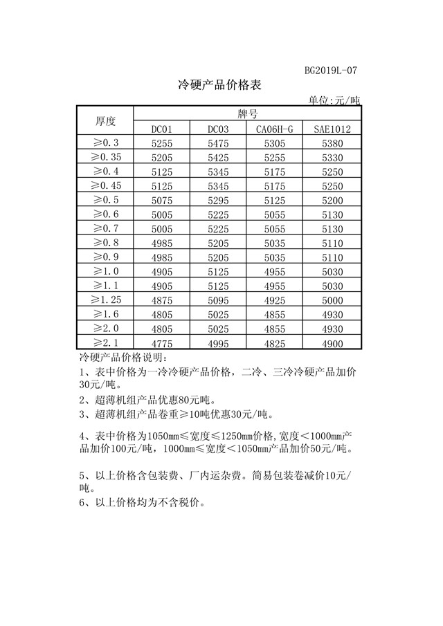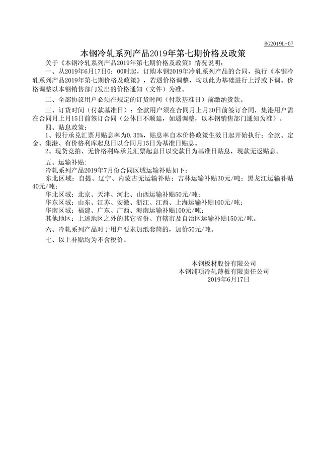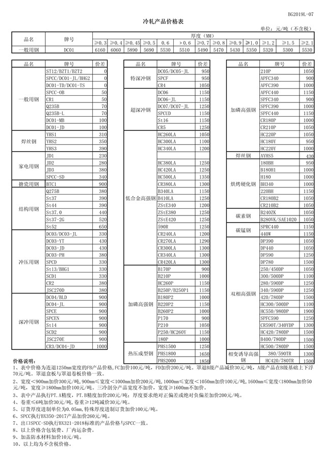 本钢及本钢辅项冷轧系列产品2019年第7期价格表及政策