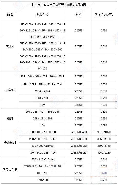 鞍山宝得2019年第四十九期现货产品价格表