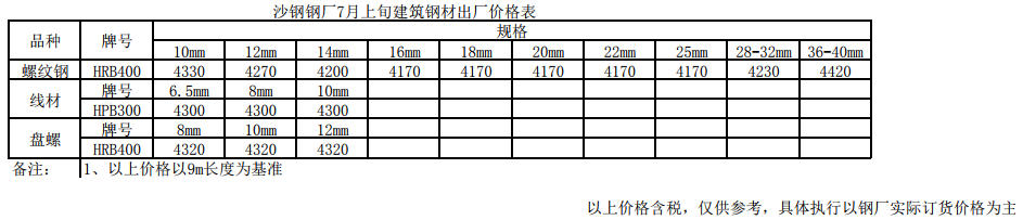 2019年7月1日沙钢钢厂建筑钢材7月上旬出厂价格表