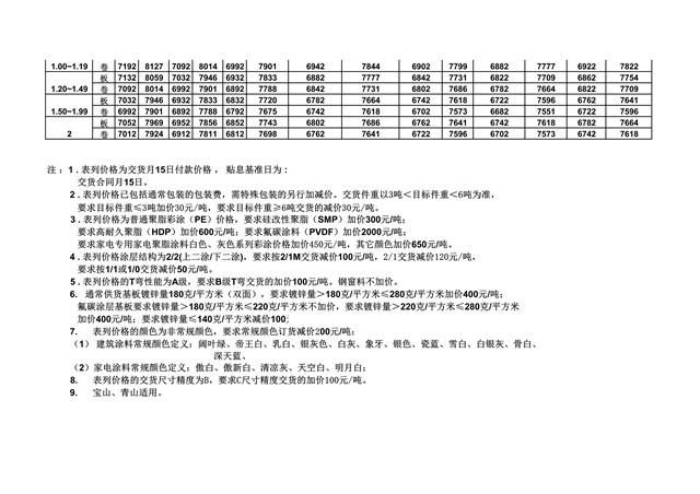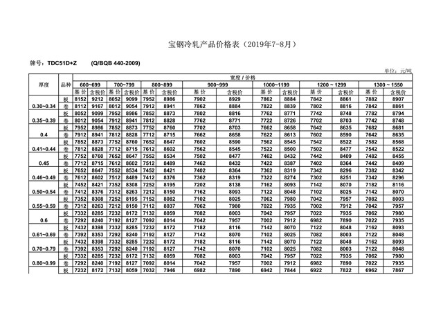 2019年7月宝钢冷轧产品价格表