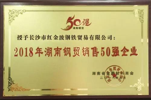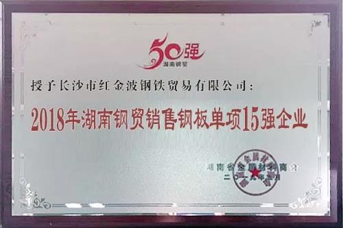 “2018年湖南钢贸销售钢板单项15强企业”称号