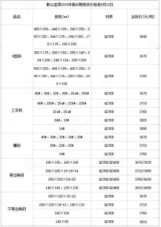 2、以上价格均为检尺含税价,执行日期自2019年8月12日起。