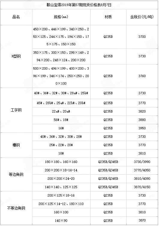 2、以上价格均为检尺含税价,执行日期自2019年8月7日起。