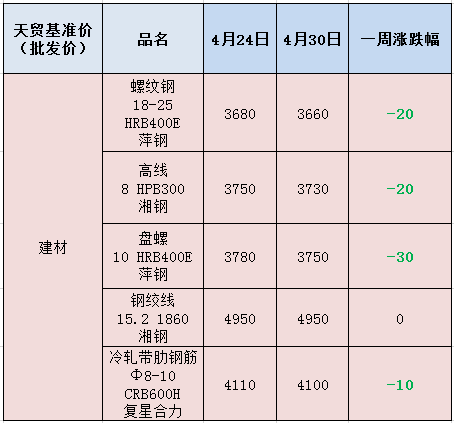 本周,长沙建筑钢材价格弱稳运行。从统计数据看,螺纹、高线、盘螺、冷轧带肋钢筋分别一周累计下跌20、20、30、10元/吨;钢绞线一周价格主流持稳。本周是五一节前最后一周,气温晴暖适宜且终端存在一定备货需求,市场保持较大期待。不过受期货市场震荡下跌和库存、资金压力较大等因素影响,市场维稳意愿占据主导。近期部分商家为刺激出货,报价小幅暗降。周五根据天贸钢铁网终端结算价长沙市场4月30日报价来看:板材方面:普板下跌10;建材、管材、型材、不锈钢、优钢等品类价格主流持稳。
