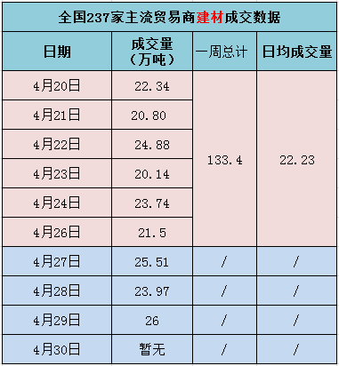 从数据看,4月27日全国237家主流贸易商建材成交量为25.51万吨;4月28日为23.97万吨;4月29日为26万吨,本周前三天建材成交量较上周增加7.46万吨。本周出货走量尚可,但产量也有增加潜力,目前市场比较担心的是“高需求能不能持续到整个5月”,业内对后续各环节利润及库存消化速度仍保持较大关注。