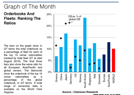 按区域划分,在2019年8月初,欧洲船东手持订单占现有船队比例约为8%,低于全球平均水平;而亚太地区船东手持订单占现有船队比例则超过13%。同时,欧洲船东手持订单量占全球总手持订单量的33%,亚太地区船东占53%。这些数据表明,虽然目前欧洲船东拥有的船队规模(6.04亿GT)依然大于亚太地区船东的船队规模(5.68亿GT),但未来两者之间的差距可能会进一步缩小。